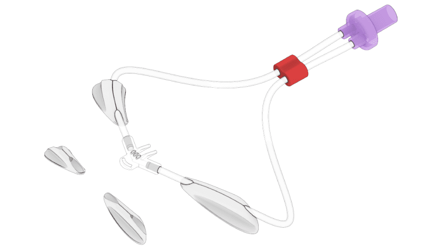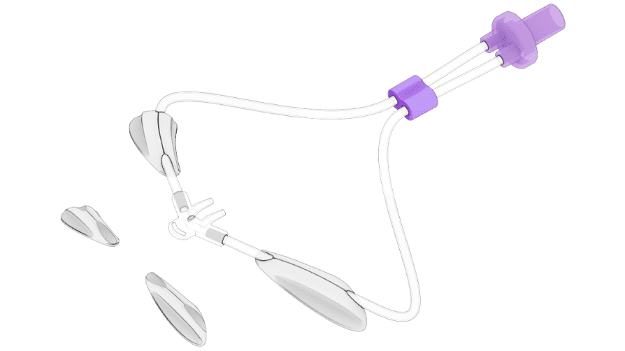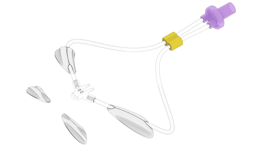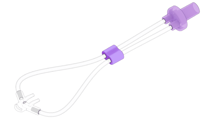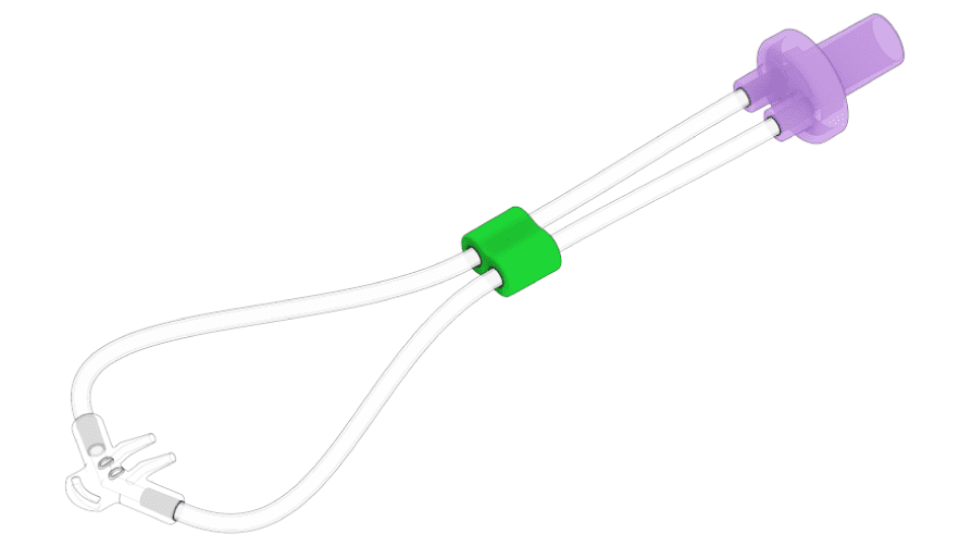 The NeoFlow® nasal cannula prongs include a positioning tab for easy alignment in the nares. They are compatible with the NeoFlow® bonnet, optionally reducing the need for fixation to the skin.